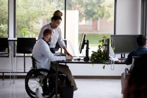 Mid adult wheelchair-bound businessman and a female colleague review a current project. They are looking at something on a desktop computer.
